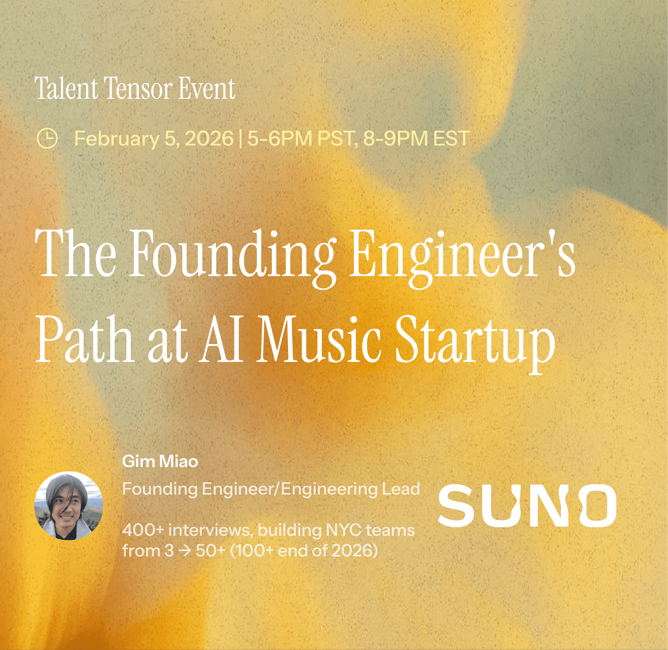 Gim Miao is a founding engineer and engineering lead at Suno, where he works on AI systems powering music creation at scale. As one of the earliest engineers, Gim has played a central role in shaping both the technical foundations and the engineering culture of an AI-native startup.